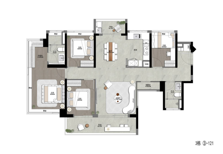 这两个面积段的布局差不多,只不过121平多了入户的独立玄关和小阳台,通透性更好,尺寸也大了一圈。